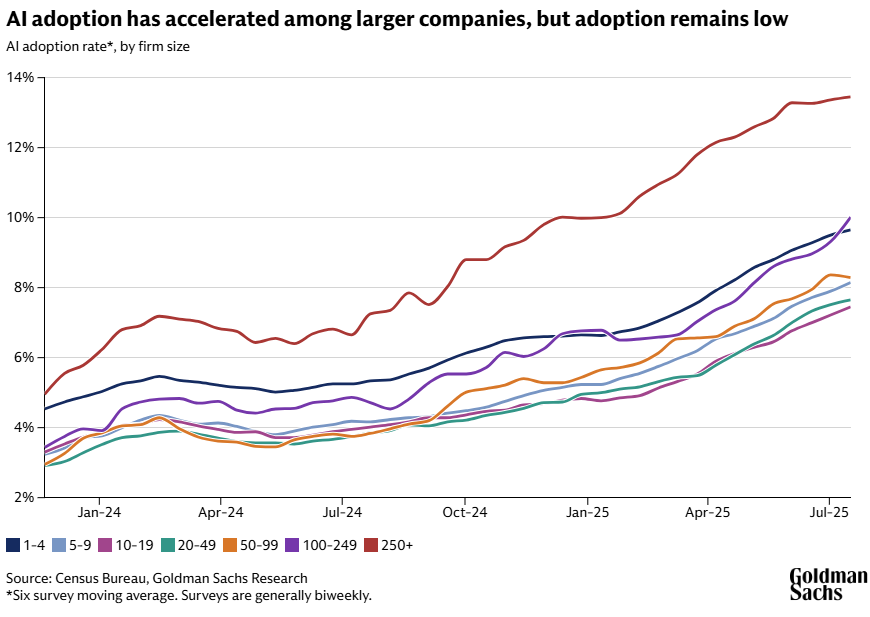 Dito isso, a adoção da IA ainda é relativamente baixa, especialmente entre empresas de médio e pequeno porte. Embora as taxas de adoção tenham acelerado recentemente, a grande maioria das empresas ainda não incorporou a IA aos fluxos de trabalho regulares. Em uma pesquisa recente nos EUA, apenas 9,3% das empresas relataram ter utilizado IA generativa em produção nas últimas duas semanas.