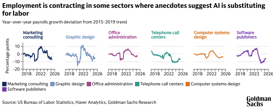 Ainda assim, já há sinais iniciais de disrupção em setores específicos. O crescimento do emprego em áreas como consultoria de marketing, design gráfico, administração de escritório e centrais de atendimento telefônico ficou abaixo da tendência, em meio a relatos de redução na demanda por mão de obra devido a ganhos de eficiência relacionados à IA.