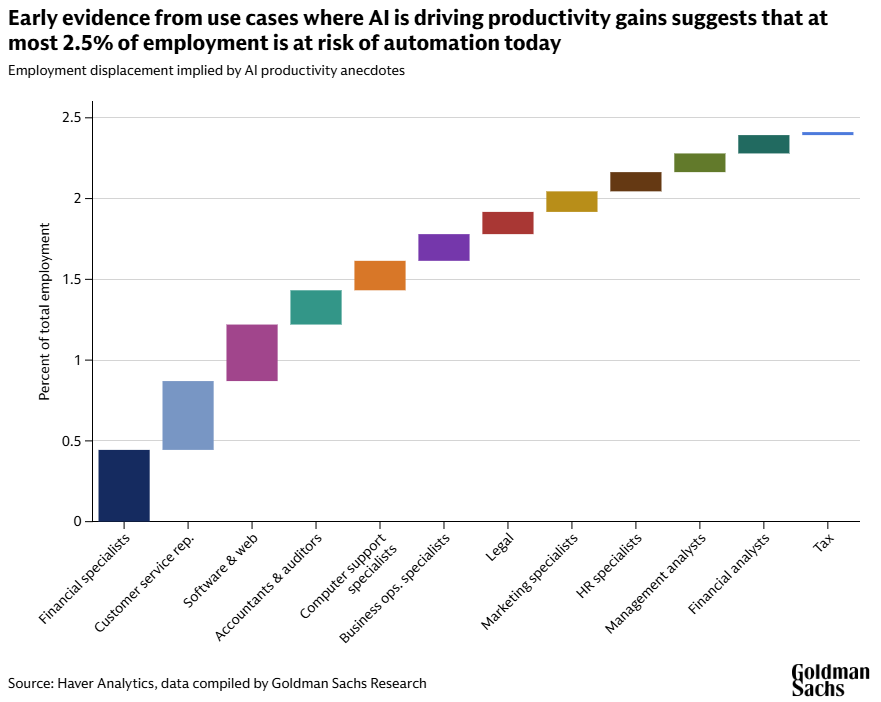 Apesar das evidências consistentes do impacto da IA nas contratações, o leque de posições afetadas continua restrito. Se os casos de uso atuais da IA fossem expandidos para toda a economia, o Goldman Sachs Research estima que apenas 2,5% dos empregos nos EUA estariam sob risco de deslocamento.