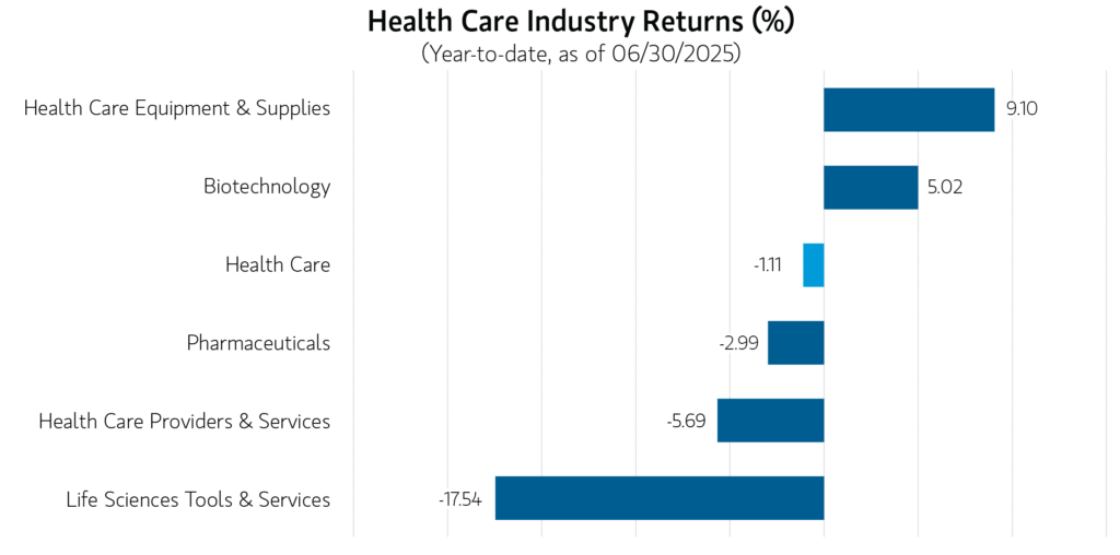 Um dos maiores obstáculos enfrentados pelo setor tem sido a incerteza política e regulatória em torno das políticas da administração Trump sobre preços de medicamentos e tarifas — impactando especialmente as empresas farmacêuticas. A subindústria de planos de saúde também tem sofrido pressão, liderada pelos problemas recorrentes da UnitedHealth Group, incluindo a saída de seu CEO, a retirada das projeções para 2025 e diversas investigações em andamento.