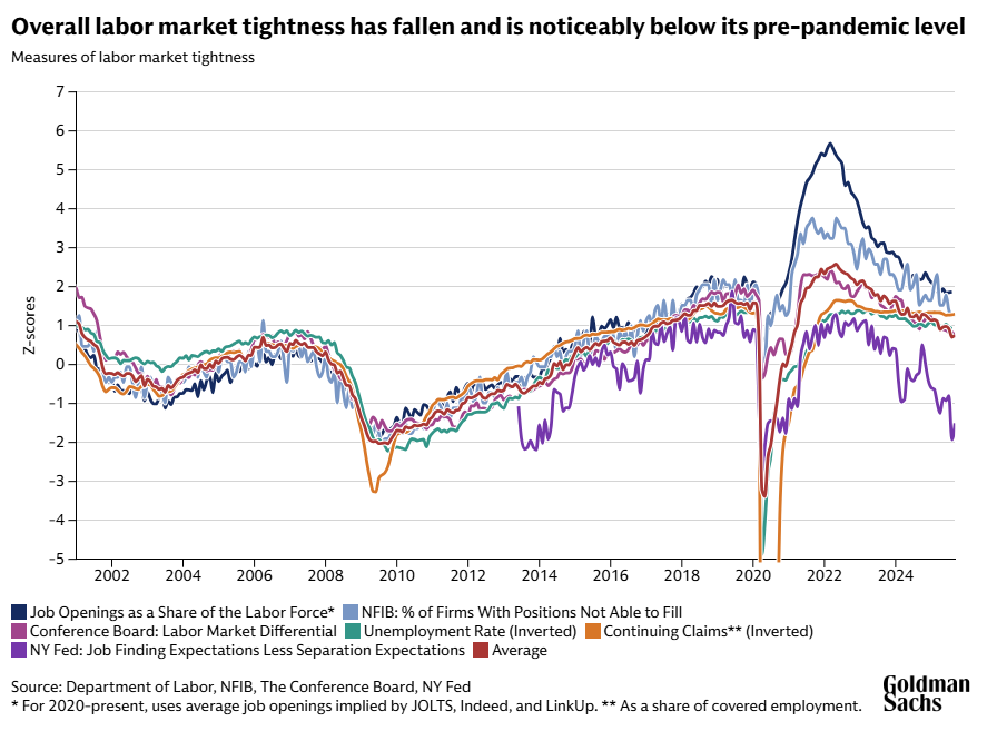 Os dados do mercado de trabalho são “improváveis de transmitir uma mensagem tranquilizadora de forma convincente” até a reunião do FOMC em dezembro, acrescenta Mericle. A Goldman Sachs Research vê sinais de que a fraqueza no mercado de trabalho dos EUA “é genuína”. Além disso, demissões adiadas de funcionários públicos instigadas pelo Department of Government Efficiency [Departamento de Eficiência do Governo] provavelmente gerarão um relatório de folhas de pagamento negativo em outubro e “pesarão um pouco em novembro”, escreve Mericle.