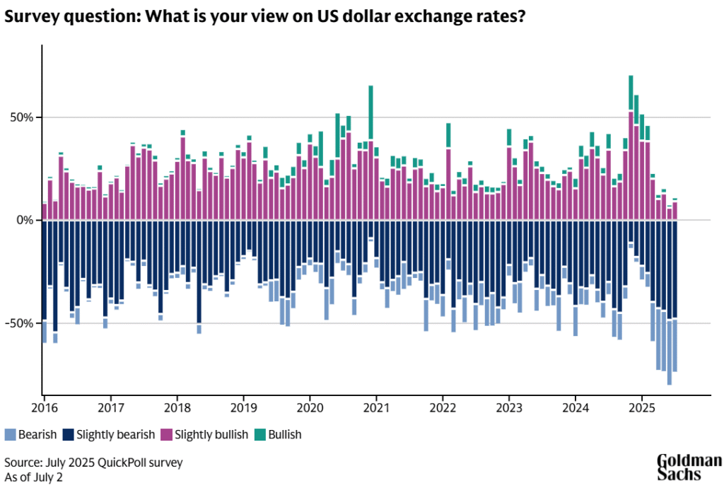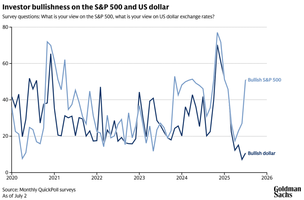 Investidores estão sinalizando crescente confiança nas ações dos EUA — especialmente nas grandes empresas de tecnologia conhecidas como as Magnificent 7 — segundo uma pesquisa com investidores institucionais conduzida pela Goldman Sachs Global Banking & Markets. Ao mesmo tempo, a proporção de participantes que esperam enfraquecimento do dólar, em meio a preocupações fiscais crescentes nos EUA, está próxima de um recorde histórico.