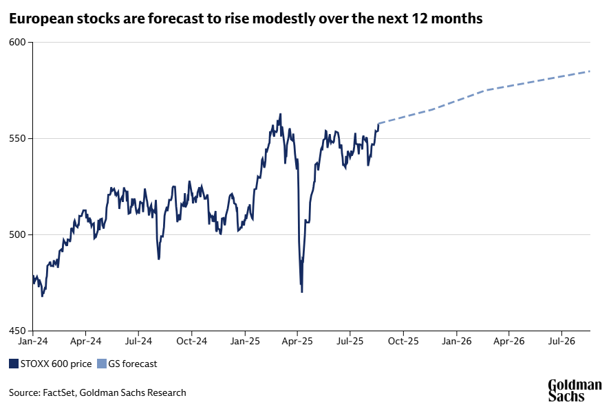 O Goldman Sachs Research prevê que o STOXX Europe 600 subirá cerca de 5%, para 580 pontos, nos próximos 12 meses (a partir de 1º de setembro). A equipe estima um retorno total de 12 meses, incluindo dividendos, de 8%.