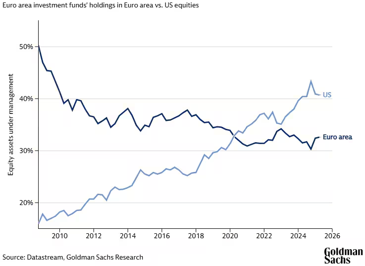 Apesar da recente recuperação da demanda, a alocação dos investidores em ações europeias continua relativamente baixa, especialmente entre investidores baseados na Europa (os investidores domésticos europeus aumentaram significativamente sua alocação em ativos dos EUA nos últimos 15 anos, passando de 15% em 2009 para mais de 40% atualmente).