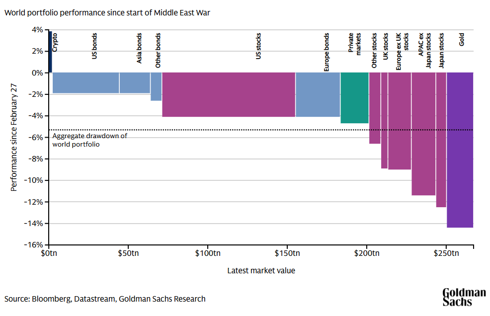 As ações caíram e os yields [rendimentos] dos títulos subiram desde o início do conflito, mas, até agora, as perdas em portfólios balanceados, como os que contêm 60% em ações e 40% em títulos, têm sido “relativamente pequenas”, segundo Christian Mueller-Glissmann, head de asset allocation [alocação de ativos] no Goldman Sachs Research.