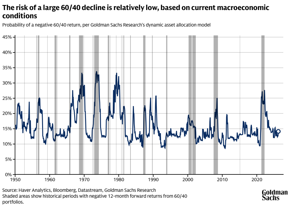 Nosso modelo baseado em machine learning [aprendizado de máquina], que prevê a probabilidade de uma queda sustentada dos portfólios 60/40 nos próximos 12 meses, ainda está razoavelmente baixo porque o crescimento ainda é bom, a inflação não está acelerando tanto e a política ainda está em afrouxamento.