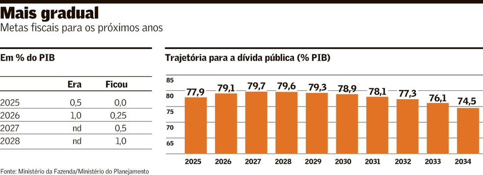 Já as metas de 2026, 2027 e 2028 foram propostas no campo positivo: 0,25% do PIB, 0,5% do PIB e 1% do PIB, respectivamente. Antes da revisão, o governo pretendia atingir um superávit de 1% do PIB já em 2026.