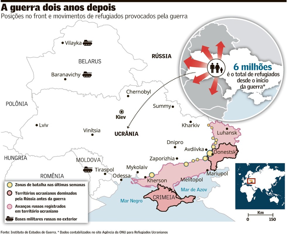 A guerra na Ucrânia completa amanhã seu segundo ano como o conflito que mais alterou os fundamentos políticos e econômicos da Europa – e do mundo – desde a 2ª Guerra, sem sinais de um final. A invasão por parte da Rússia causou mudanças estruturais em organismos de defesa, como a Organização do Tratado do Atlântico Norte (Otan, a aliança militar ocidental), e na União Europeia, que precisou buscar consensos que vinham vacilando nos últimos anos.
