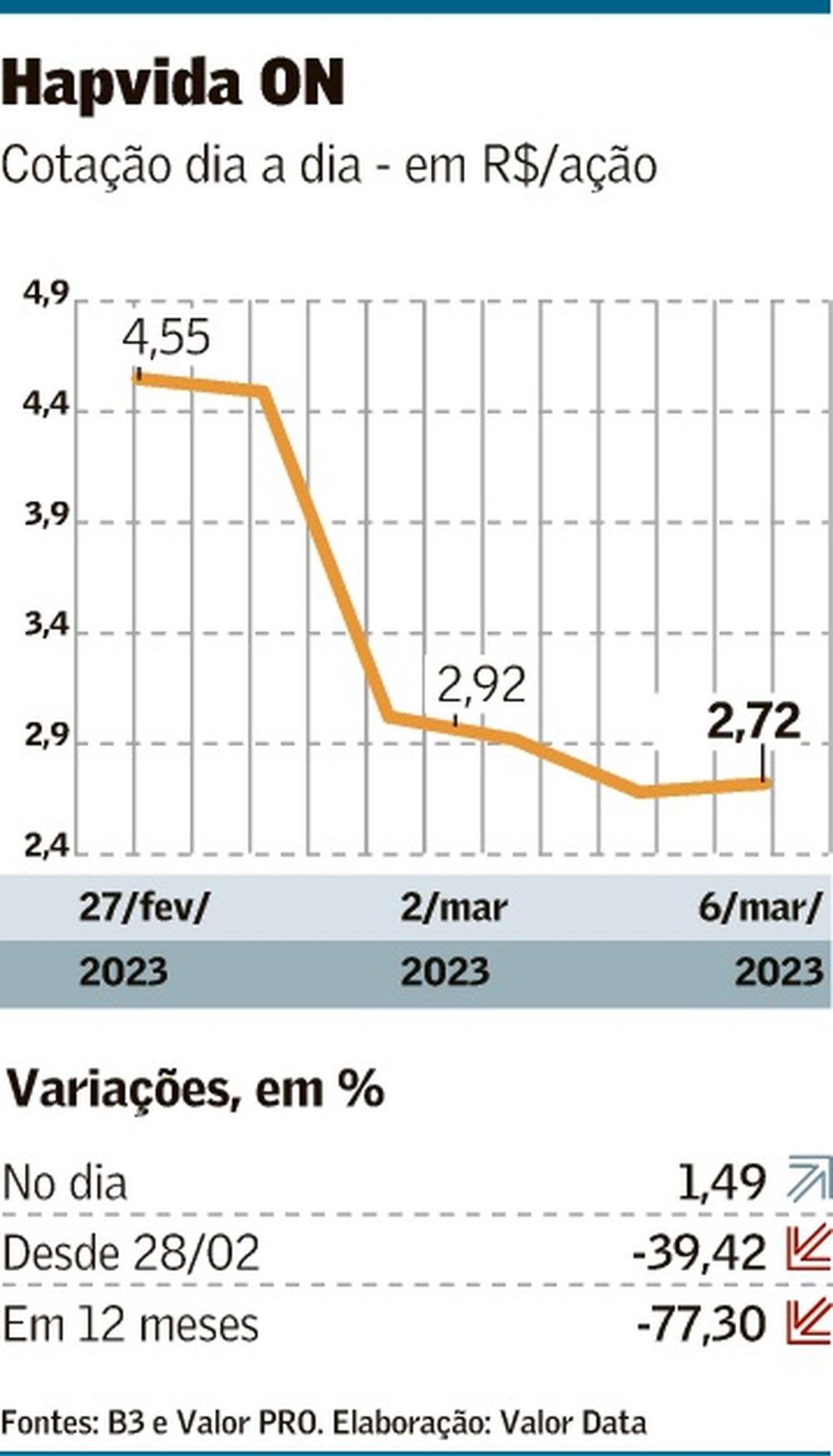 Na semana passada, as ações da Hapvida sofreram um forte baque, após divulgação de resultados do quarto trimestre. Nesta segnda-feira, os papéis da operadora fecharam em alta de 1,49%, a R$ 2,72, com valor de mercado em R$ 19,4 bilhões.