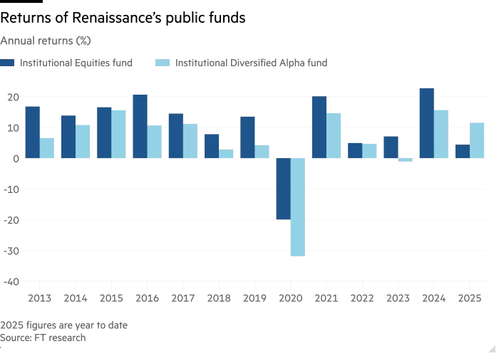 Após décadas de retornos elevados, os fundos externos da Renaissance registraram grandes perdas com os movimentos voláteis durante a pandemia, o que levou a uma queda acentuada nos ativos sob gestão externos. O Medallion Fund da empresa, frequentemente chamado de a maior máquina de fazer dinheiro da história, está fechado a investidores externos há cerca de duas décadas.