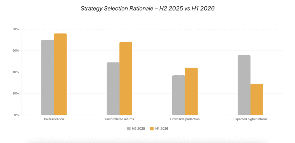 A mudança é capturada em dois pontos de dados dramáticos do Hedgeweek-AIMA H1 2026 Allocator Survey: o percentual que cita “retornos não correlacionados” como uma justificativa-chave para alocação em hedge funds disparou de 49% para 68%, enquanto aqueles que citam “retornos mais altos esperados nas condições atuais de mercado” despencou de 56% para 29%.