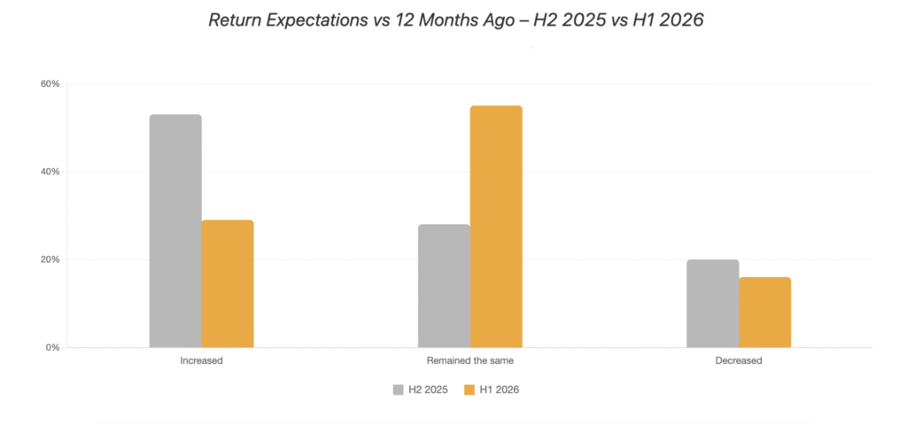 Apoiando esse reposicionamento, as expectativas de retorno se normalizaram de forma dramática. Apenas 29% dos alocadores aumentaram suas expectativas de retorno em comparação com doze meses atrás, abaixo de 53% no H2 2025. Enquanto isso, 55% esperam que os retornos permaneçam os mesmos, em comparação com apenas 28% seis meses antes.