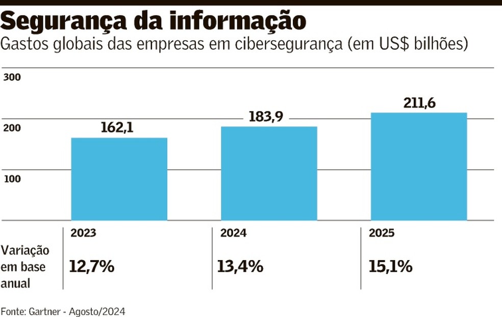 A Gartner projeta que 17% dos incidentes cibernéticos do mundo todo serão gerados com ferramentas de IA generativa, em 2027. Esse cenário ajuda a elevar os investimentos em cibersegurança de US$ 183,9 bilhões, em 2024, para US$ 211,5 bilhões em 2025, alta de 15,1%, em base anual.