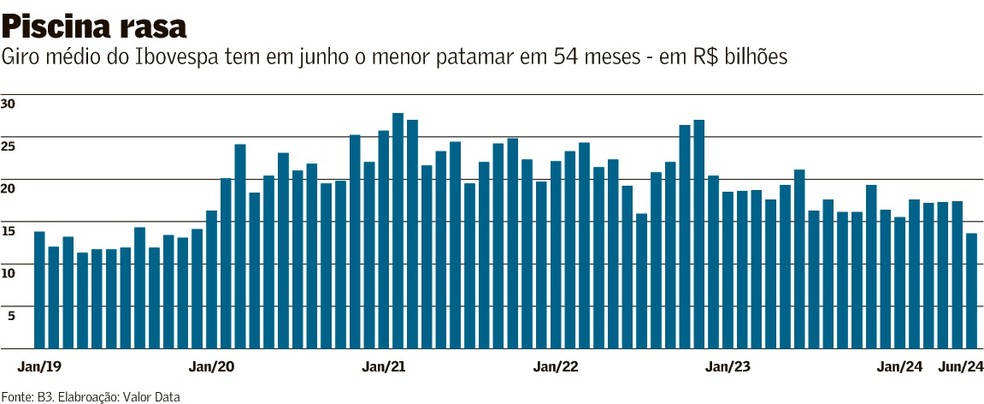 O baixo interesse de investidores globais por mercados emergentes e a crise da indústria de fundos locais, em meio a incertezas macroeconômicas domésticas e externas, têm limitado o volume de negócios na bolsa. Não por acaso, o Ibovespa registrou em junho seu menor giro financeiro médio desde dezembro de 2019, ou seja, o pior patamar em 54 meses.
