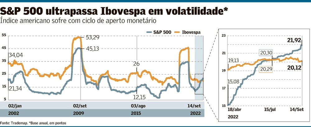 Enquanto o Ibovespa se manteve, no último ano, entre 19 e 21 pontos de volatilidade, o referencial americano, que chegou a ficar abaixo dos 12 pontos em novembro, agora se aproxima dos 22, mostra levantamento do TradeMap obtido pelo Valor. Desde 2002, a volatilidade média do Ibovespa é de 26,83 pontos, e a do S&P 500, de 17,55 pontos.