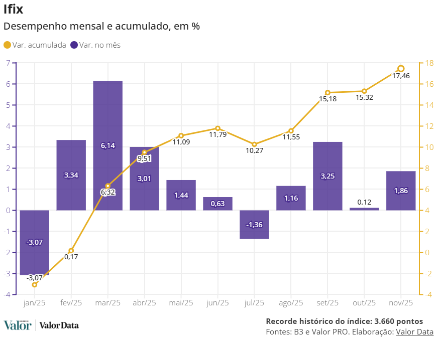 O IFIX, principal índice dos fundos imobiliários, encerrou novembro em alta de 1,9%, acumulando valorização de 17,5% em 2025, em um mês marcado pela renovação de máximas históricas do indicador. O movimento positivo refletiu, principalmente, a queda nas taxas dos títulos públicos atrelados à inflação, que têm impacto direto sobre o preço desses fundos.