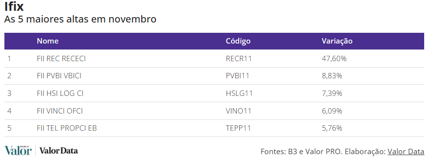 Caio Nabuco também aponta essa recuperação. “Os fundos de escritórios, que ficaram muito para trás nos últimos anos, apresentaram reação relevante em novembro. O fundo PVBI11 é um bom exemplo desse movimento”, afirma.