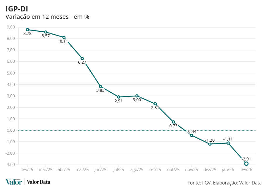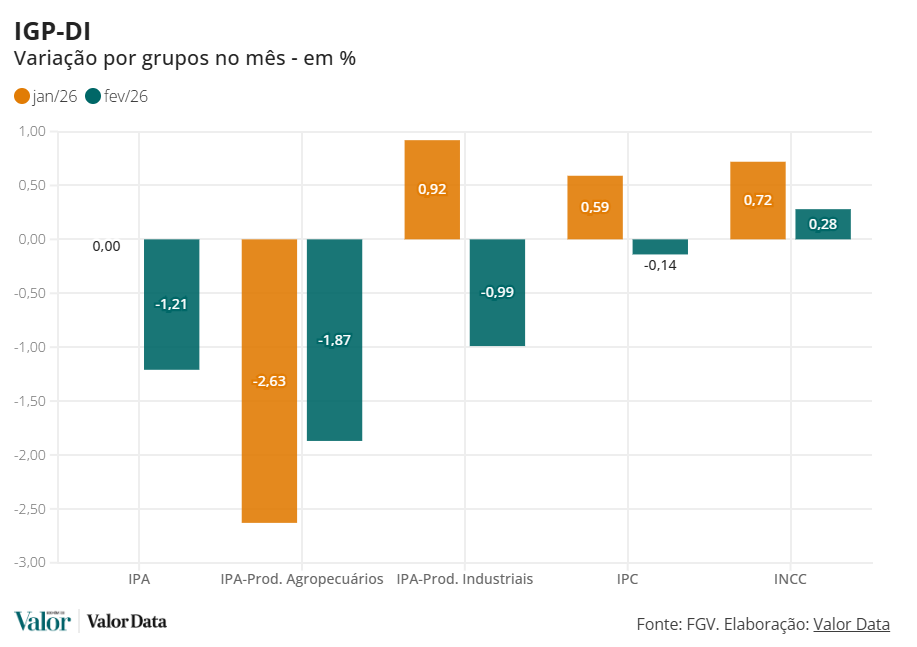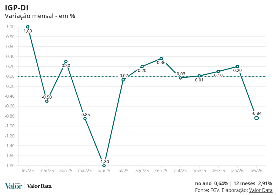 O Índice Geral de Preços – Disponibilidade Interna (IGP-DI) registrou queda de 0,84% em fevereiro, depois de subir 0,20% em janeiro, informou hoje o Instituto Brasileiro de Economia da Fundação Getulio Vargas (FGV Ibre). Em igual mês de 2025, o IGP-DI havia registrado alta de 1%.