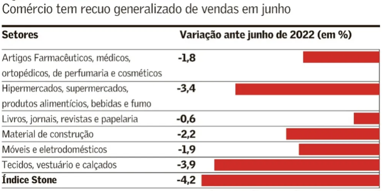 Na evolução do indicador por setores, todos os segmentos tiveram queda de vendas em junho, ante igual mês do ano passado. “O único setor que se manteve relativamente bem ao longo do ano foi artigos farmacêuticos” acrescentou. Ele frisou que as famílias, de maneira geral, não podem deixar de comprar medicamentos. “Mas móveis, eletrodomésticos, esses produtos mais caros sofreram nas vendas”, acrescentou.