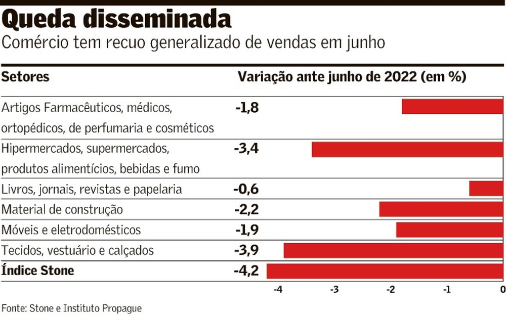 As vendas no varejo brasileiro terminaram o primeiro semestre em queda, e devem finalizar 2023 sem crescimento. É o que sinaliza a sexta edição do Índice de Atividade Econômica Stone Varejo. Na leitura do indicador, cujo resultado de junho foi antecipado ao Valor, as vendas do comércio caíram 0,1% ante maio. Na comparação com junho do ano passado, o recuo foi de 4,2% e, no primeiro semestre, a queda foi de 3,4%, ante igual período em 2022.