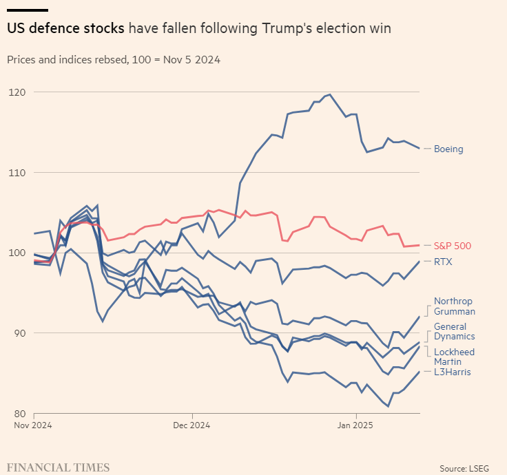 Desde a vitória eleitoral de Trump em novembro, as ações da maioria dos principais grupos de defesa dos EUA tiveram desempenho inferior ao índice S&P 500, em meio à incerteza sobre o que um segundo mandato reserva para os gastos com defesa e programas de armamento.