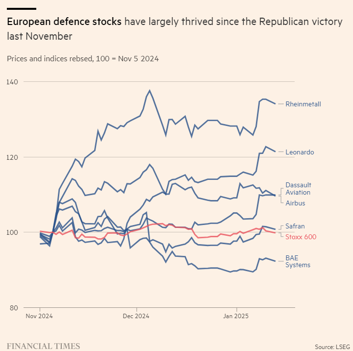 A resposta da Europa ao novo governo Trump também está sendo observada de perto. Exportações de defesa dos EUA para a Europa podem estar em risco, à medida que governos se concentram em fortalecer sua base industrial doméstica.