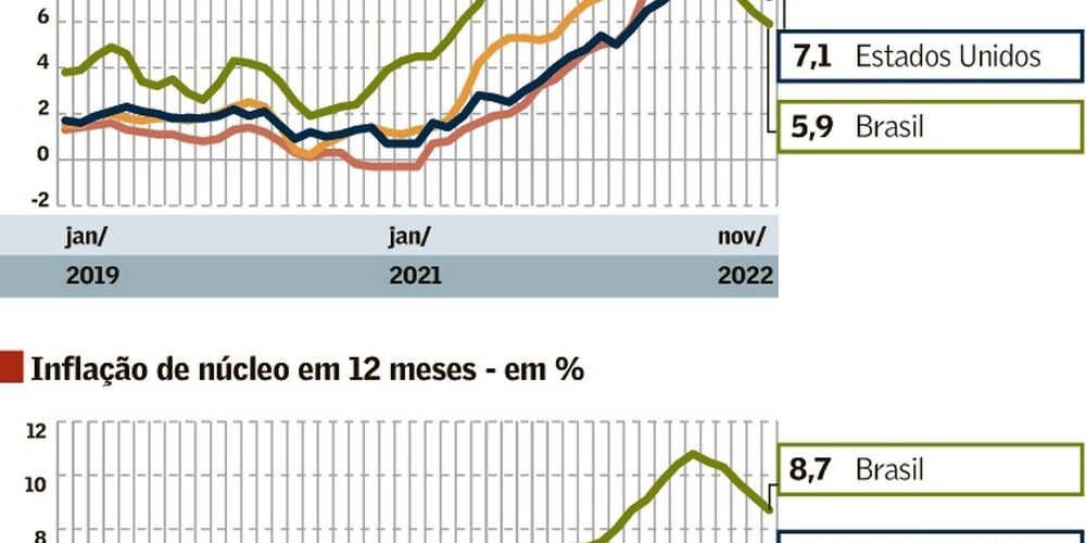 Em setembro de 2022, pela primeira vez na série analisada pelo FMI, a inflação brasileira cheia (7,1%) foi menor do que a americana (8,2%) e a da mediana de países (7,5%). Em relação à zona do euro, a mudança ocorreu um mês antes, em agosto, quando o Brasil registrou 8,6%, e os europeus, 9,1%.