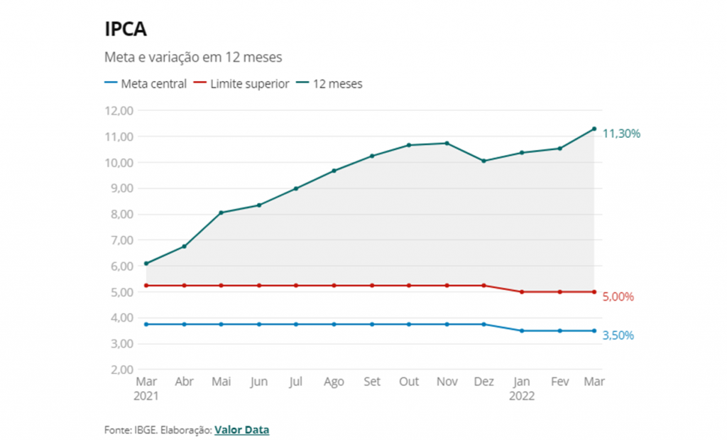 Pelo indicador acumulado em 12 meses, o IPCA ficou em 11,3% em março, ante 10,54% até fevereiro. O resultado ficou acima do centro da meta inflacionária estabelecida pelo Banco Central (BC) de 3,5% para 2022 – sendo que a meta tem margem de tolerância de 1,5 ponto percentual, para mais ou para menos. Para o resultado acumulado em 12 meses, a mediana das estimativas do Valor Data era de 10,97%, com projeções entre 10,12% e 11,09%.