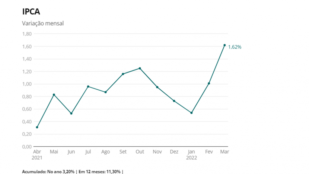 A taxa de março também é a maior variação mensal para o índice desde janeiro de 2003, quando foi de 2,25%. Em março de 2021, o IPCA registrou elevação de 0,93%.