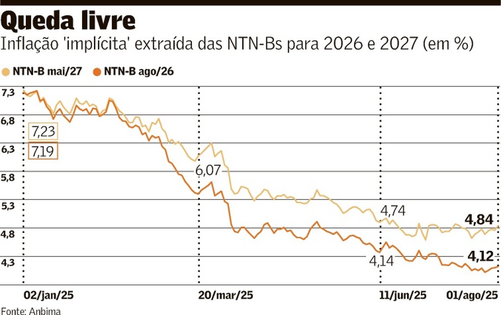 A inflação extraída da NTN-B para agosto de 2026 opera a 4,12%, após ter começado o ano acima de 7,20%. Já a inflação “implícita” extraída da NTN-B para maio de 2027 recuou de 7,23% em janeiro para 4,84% na última sexta-feira.