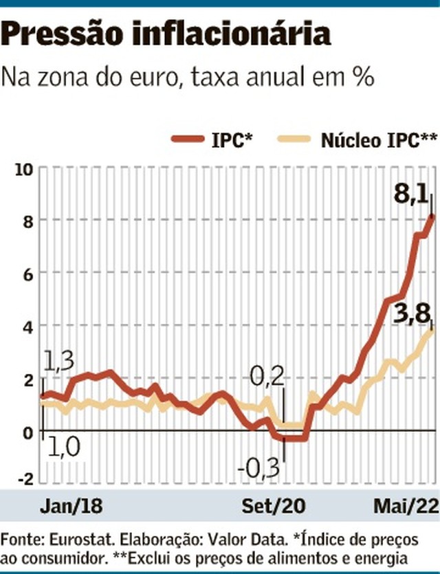A inflação ao consumidor na zona do euro subiu bem mais que o esperado e atingiu a alta recorde de 8,1% ao ano em maio, aumentando a probabilidade de o Banco Central Europeu (BCE) vir a elevar sua taxa de juro básica em julho.