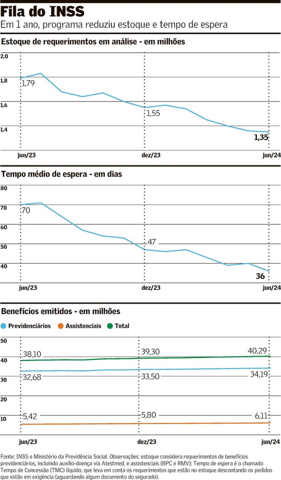 Desde a implantação do programa, o sistema ficou mais ágil, o que garante o acesso à seguridade social para quem de fato precisa. Em junho de 2023, antes de lançamento da medida, o Instituto Nacional do Seguro Social (INSS) estimava que havia quase 1,8 milhão de pedidos de benefícios previdenciários e assistenciais aguardando análise. Destes, 597 mil eram de auxílio-doença, tecnicamente classificado como auxílio incapacidade temporária. Já em junho deste ano (último dado disponível), o estoque de requerimentos caiu para 1,3 milhão, sendo 334 mil de auxílio-doença.