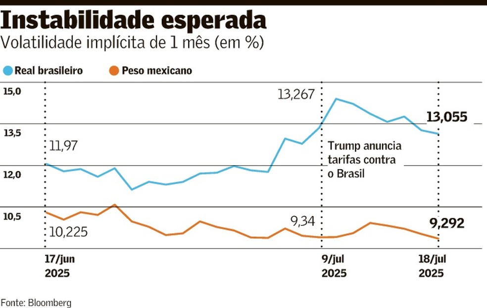 É possível notar, ainda, algum descolamento do real em relação ao peso mexicano, não somente na cotação das moedas, mas também na volatilidade esperada à frente. Após Trump anunciar a imposição de tarifas de 50% contra produtos brasileiros a partir de agosto, a volatilidade implícita de um mês do real saltou a 14,3%, maior nível desde o fim de abril, enquanto a do México não mostrou variação relevante, mesmo com a indicação de que os produtos do país também sofrerão taxas mais altas ao entrarem nos EUA.
