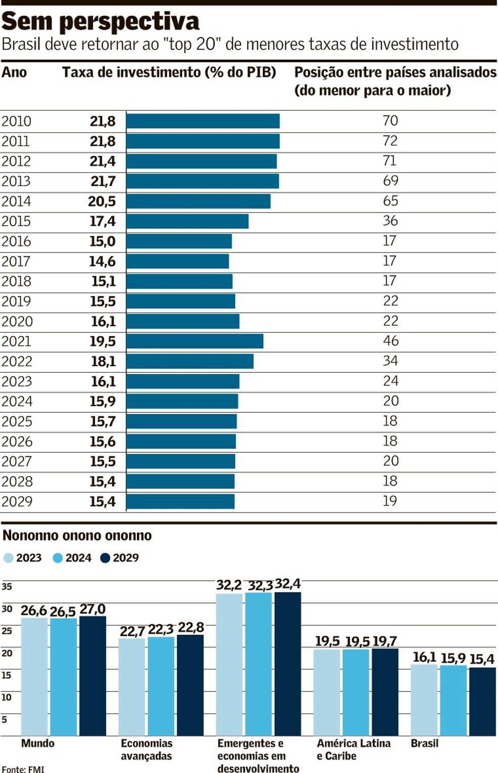Segundo o FMI, o Brasil deve fechar 2024 com uma taxa de investimento de 15,9% do PIB, a 20ª pior entre os países analisados. Em 2029, com uma taxa de 15,4%, o país seria o 19º pior, vindo da 18ª posição em 2028. É menos que as projeções do FMI para a América Latina (19,7%) e emergentes em geral (32,4%) em 2029.