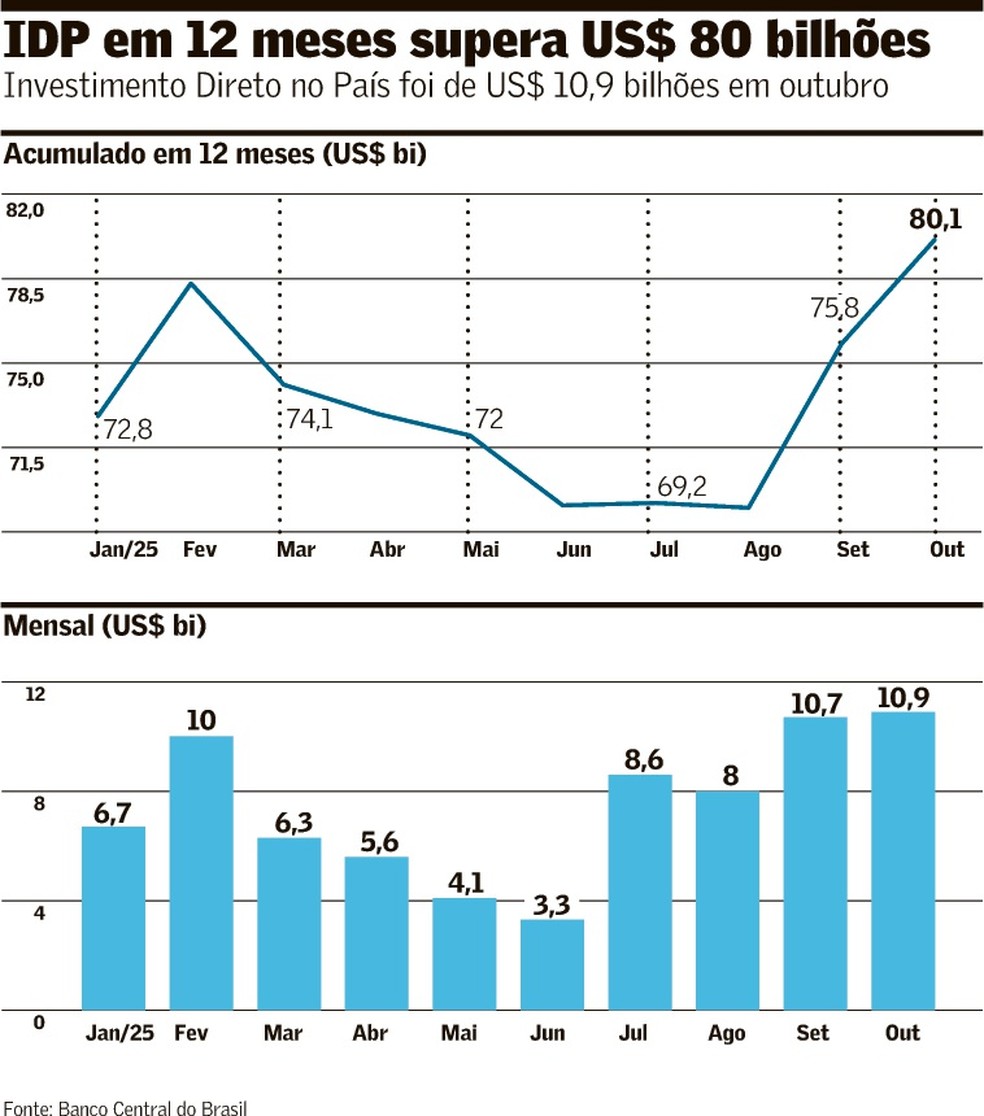 No resultado mensal de outubro, o IDP superou a expectativa de US$ 6,7 bilhões da XP Investimentos, que revisou a projeção para o resultado de 2025 de US$ 75,6 bilhões para US$ 79,6 bilhões. A economista da XP Luiza Pinese destaca em nota que esses recursos “seguem apresentando forte desempenho neste ano, sustentado principalmente pelos ingressos em participação no capital”.