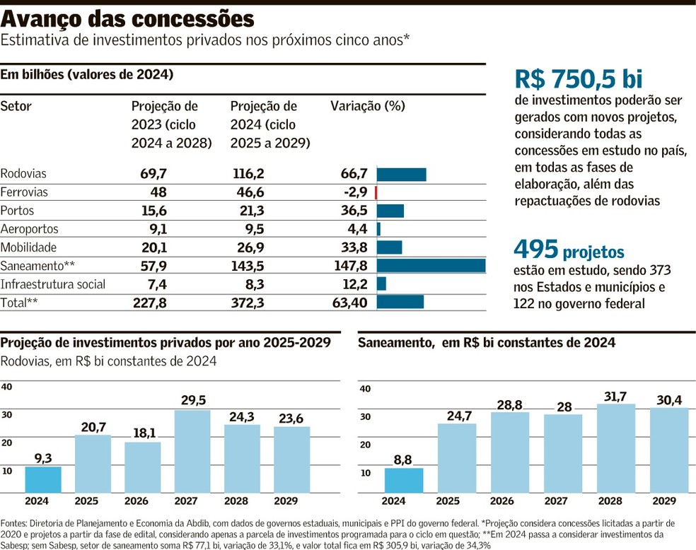 O avanço dos projetos privados é apontado como essencial para garantir a alta dos investimentos de infraestrutura no país, ainda abaixo do necessário. Em 2024, o Brasil deverá chegar a R$ 259,3 bilhões, aumento de 15,3% na comparação anual, segundo a Abdib, que considera transportes, energia elétrica, telecomunicações e saneamento. Houve aumento do lado dos aportes públicos, mas a maior parte (76%) vem do setor privado, que neste ano deve atingir recorde de investimento.