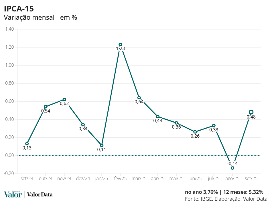 O Índice Nacional de Preços ao Consumidor Amplo -15 (IPCA-15) – considerado a prévia da inflação oficial no país – subiu 0,48% em setembro, após recuo de 0,14% em agosto, informou nessta quinta-feira o Instituto Brasileiro de Geografia e Estatística (IBGE). Em setembro de 2024, o IPCA-15 tinha subido 0,13%.