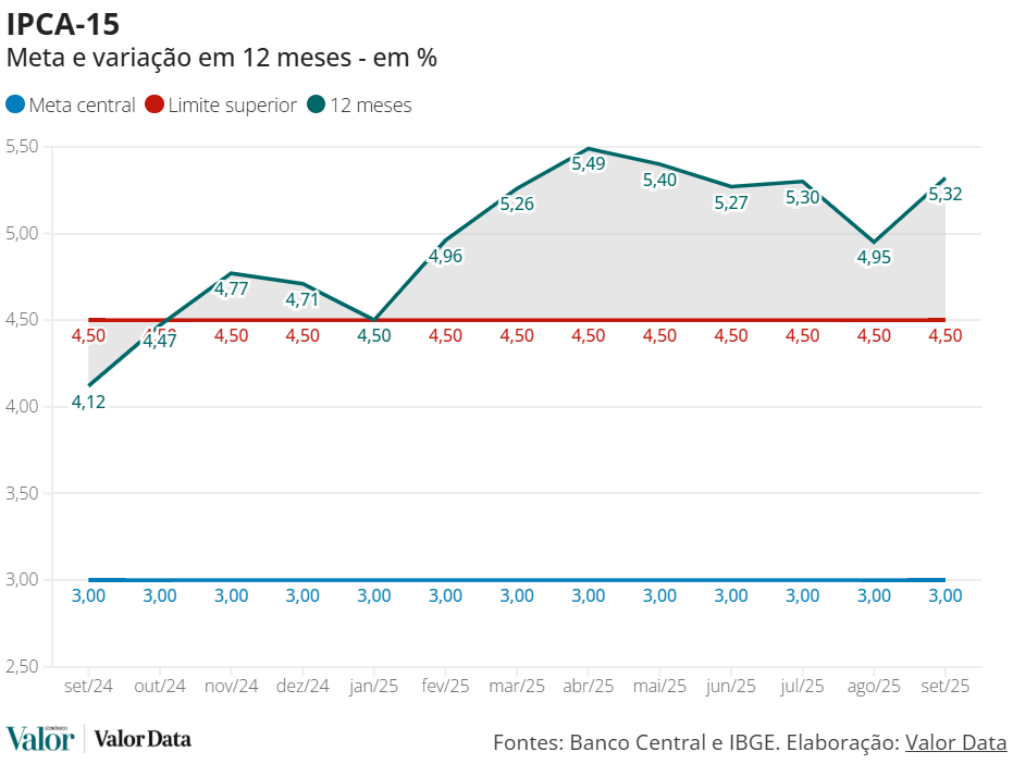 Com o dado de setembro, o IPCA-15 acumula aumento de 5,32% em 12 meses. Até agosto, o resultado em 12 meses era de 4,95%. Já o acumulado do IPCA-15 em 2025, até setembro, foi de 3,76%.