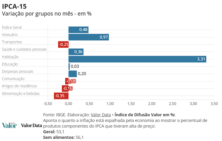 Das nove classes de despesas usadas para cálculo do IPCA-15, habitação mudou de rumo entre agosto e setembro (de -1,13% para 3,31%) – principal pressão no IPCA-15 do mês – e vestuário (de 0,17% para 0,97%).