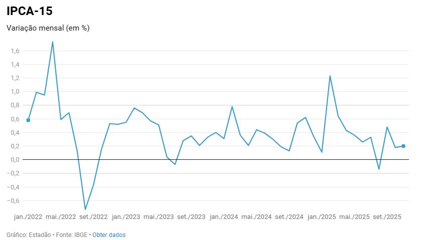 O Estadão/Broadcast calcula o impacto de cada grupo no IPCA-15 com base na variação mensal e no peso mensal disponíveis no Sistema IBGE de Recuperação Automática (Sidra). O resultado pode ter divergências pontuais com o impacto divulgado pelo IBGE, que considera mais casas decimais do que as disponibilizadas publicamente na taxa de cada item.