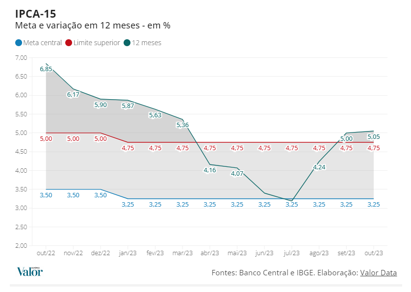 Com o dado de outubro, o IPCA-15 acumula alta de 5,05% em 12 meses, ante 5% nos 12 meses até setembro, ficando acima da mediana das 36 estimativas coletadas pelo Valor Data, que era de 5,04%, com intervalo entre 4,98% e 5,19%. A meta de inflação perseguida pelo Banco Central (BC) para 2023 é de 3,25%, com tolerância de 1,5 ponto percentual para baixo ou para cima.
