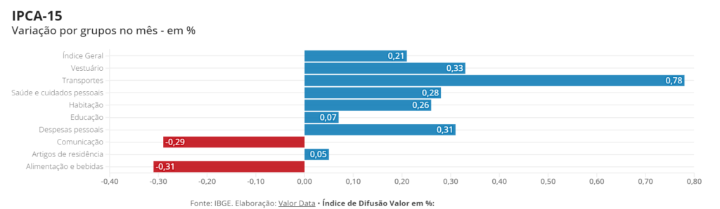 Alimentação e bebidas abrandaram a trajetória de baixa (de -0,77% para -0,31%), enquanto artigos de residência mudaram de rumo (de -0,47% para 0,05%). Com altas mais marcadas, ficaram saúde e cuidados pessoais (de 0,17% para 0,28%) e educação (de 0,05% para 0,07%).