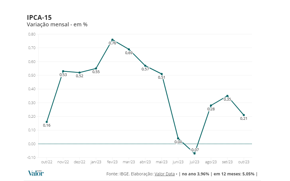 O Índice Nacional de Preços ao Consumidor Amplo-15 (IPCA-15) – considerado a prévia da inflação oficial no país – subiu 0,21% em outubro, após alta de 0,35% em setembro, informou nesta quinta-feira o Instituto Brasileiro de Geografia e Estatística (IBGE). Em outubro de 2022, o IPCA-15 tinha subido 0,16%.