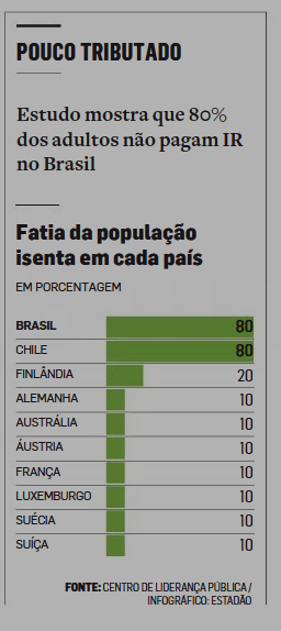 Com um sistema tributário complexo, o Brasil se tornou um raro exemplo de País com a grande maioria da população isenta do pagamento de Imposto de Renda (IR). Um levantamento do Centro de Lideranças Públicas (CLP) mostra que apenas 20% dos brasileiros adultos pagam o tributo. O cenário é diferente do observado nas economias mais ricas do mundo. Na França e na Alemanha, por exemplo, 90% dos habitantes são tributados.