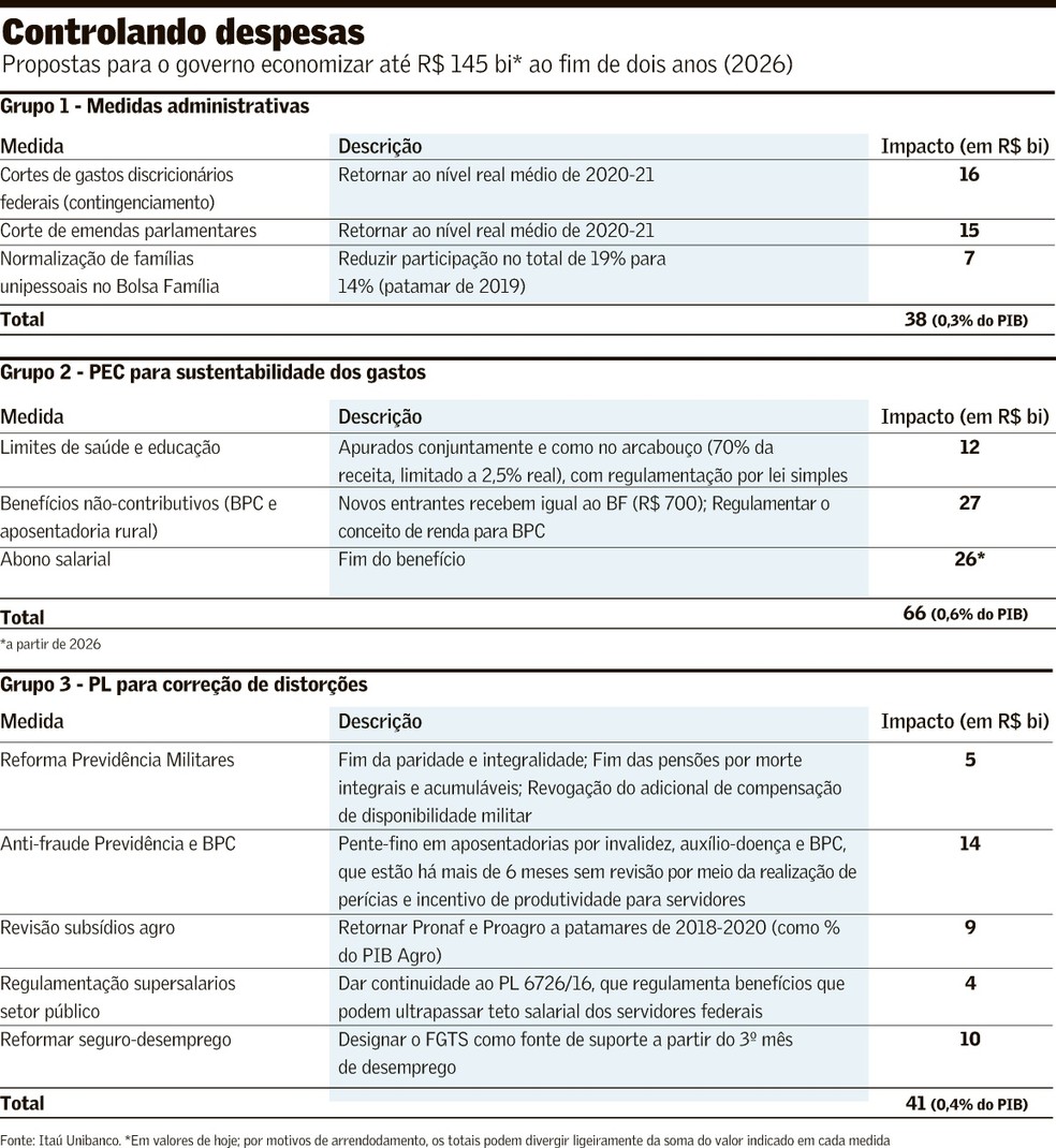 Medidas com foco no cumprimento do arcabouço fiscal no curto prazo, na desvinculação de despesas às receitas e ao salário mínimo bem como na correção de distorções em gastos obrigatórios podem levar a uma economia de até R$ 145 bilhões (1,3% do PIB) ao final de dois anos, em 2026, aponta relatório do Itaú Unibanco.