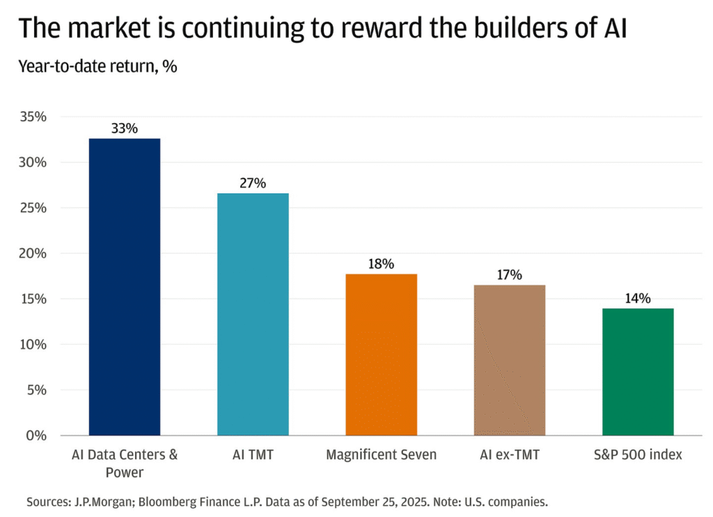 Em suma, a IA permanece um tema secular que recomendamos perseguir. Com o recente corte de juros do Fed, custos de financiamento mais baixos e valorações acionárias mais altas estão tornando projetos intensivos em capital mais atraentes, alimentando mais investimento e adoção em todo o ecossistema de IA. À medida que a infraestrutura e o uso de IA continuam a se expandir, vemos um ciclo de crescimento e oportunidade que se retroalimenta.