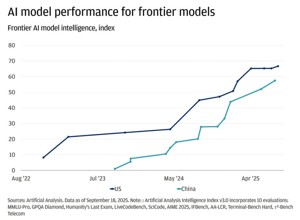 Seria preocupante se os modelos mais novos de IA não estivessem performando melhor do que seus predecessores, ou se exigissem menos poder para apenas pequenas melhorias — o que sugeriria que os hyperscalers podem estar gastando demais. Em vez disso, estamos vendo sinais promissores: modelos líderes tanto dos EUA quanto da China continuam a melhorar e o poder computacional necessário para treiná-los segue aumentando.