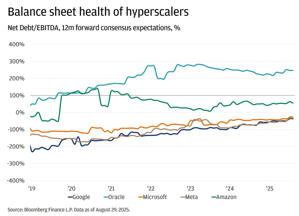 O investimento contínuo em IA só é sustentável se houver capital suficiente e nenhum sinal de sobreinvestimento. Com exceção da Oracle, os principais hyperscalers que constroem infraestrutura de dados de IA têm menos dívida no balanço do que geram de lucro e três de cinco possuem caixa excedente.