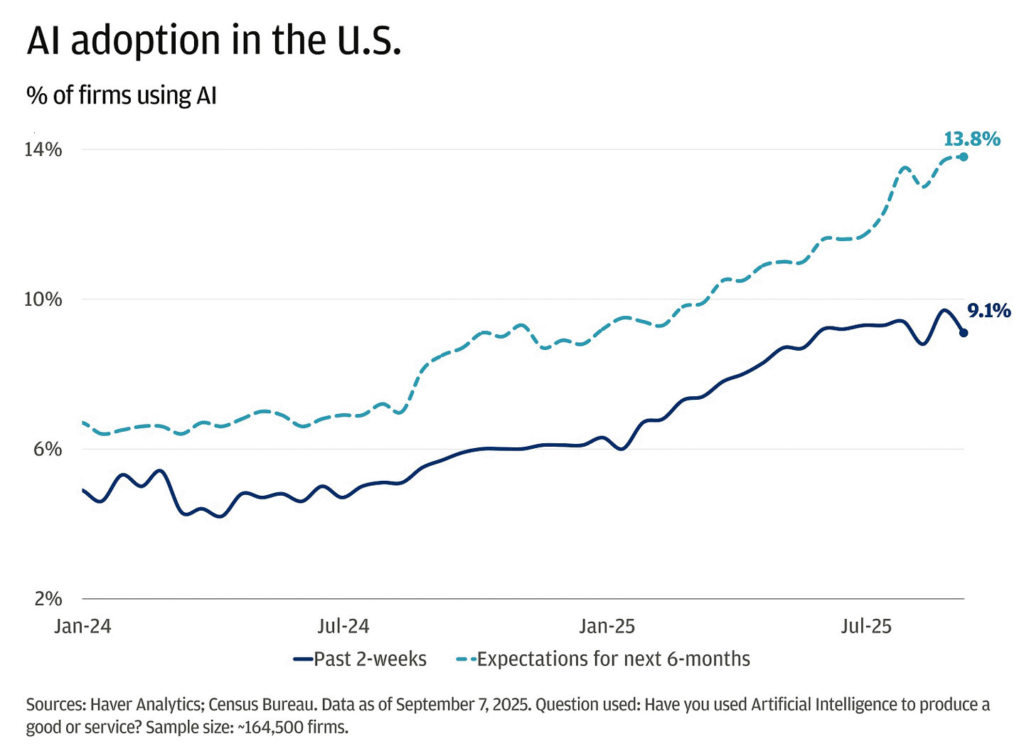Segundo uma pesquisa recente do Census Bureau, a adoção de IA nos EUA saltou 60% ao longo do último ano, mas apenas 9,1% das empresas relatam usar ativamente a tecnologia para produzir bens ou serviços — deixando bastante espaço para crescimento adicional. Vale notar que a pesquisa pergunta: “Você usou Inteligência Artificial para produzir um bem ou serviço?” Essa formulação é desenhada para capturar empresas usando IA de forma produtiva e será menor do que outras medidas de adoção de IA baseadas em gastos com IA. Por exemplo, o índice Ramp AI mede o número de empresas que pagam por assinaturas de IA e apresenta taxas de adoção de até 44,5%. Embora o gasto seja importante, acreditamos que, em última instância, serão os bens e serviços produzidos a partir da IA que destravarão os ganhos de produtividade para a economia.