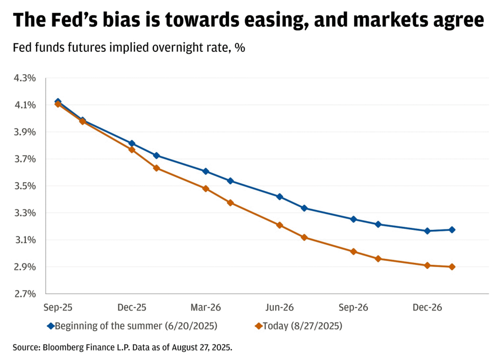 Os mercados em grande parte concordam no curto prazo: as chances de um corte em setembro estão em cerca de 90%, e os preços implícitos indicam quase 50 pontos-base de afrouxamento até o fim do ano. Os únicos dois obstáculos para um corte em setembro são o relatório de empregos de agosto (divulgado em 5 de setembro) e os dados do Índice de Preços ao Consumidor (CPI) de agosto (divulgados em 11 de setembro). A menos que haja uma surpresa significativa em qualquer um, os cortes devem ocorrer. Se as expectativas permanecerem ancoradas e os dados do trabalho se enfraquecerem ainda mais, é provável que o Fed corte mais uma vez após setembro. Após Jackson Hole, os mercados ainda projetam a fed funds rate em torno de 3,8% até o fim do ano, 3,2% em meados de 2026 e 3% até o final de 2026.